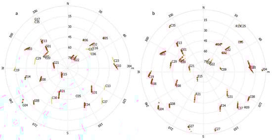 (a) Satellite sky plot from the Samsung S21 Ultra, and (b) satellite sky plot from the Xiaomi Mi8, including observations from the multi-GNSS in the first part of the operation.