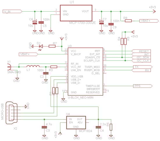 The study of navigation receiver performance was accomplished by preparing a PCB board using the widely used GNSS receivers, such as the NEO or MAX receiver series from U-blox AG company. Pin-compatible receivers have also been introduced by other companies, such as MinewSemi Co., Ltd. (Shenzhen, China). The main positioning task was solved by the GNSS receiver (Figure 3). It is based on different GNSS modules depending on the required accuracy. If standard accuracy is required (σ ≤ 2.5 m), then modules like U-blox NEO-M9N or GP-01 GPS + BDS Compass ATGM332D may be used. If high-precision accuracy is required (sub-meter level), then a MinewSemi ME32GR01 module may be used, which is a multi-constellation (GPS, Beidou, GLONASS and Galileo), concurrent, simultaneous multi-constellation L1 + L5 positioning GNSS module. All the GNSS receivers mentioned are pin-compatible and support UART and I2C protocols, while U-blox modules additionally provide a USB connection, which allows high-speed data transmission or direct connection to a PC. As the board is powered by providing 5 V at Vin pin, a CMOS low-dropout (LDO) voltage regulator should be used, such as MCP1700T-3302, to convert the input voltage to 3.3 V as a GNSS-receiver power supply. The selection of this LDO regulator is set due to the very low drop-out voltage of only 178 mV@250 mA load; the LDO output is stable only when using 1 μF output capacitance. Simultaneously, the VDD_USB input at U-blox receivers is powered using another CMOS LDO, such as MCP1824, which is distinguished by enabling (EN) input.