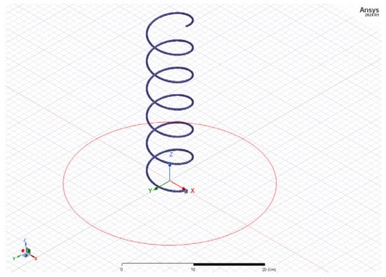 For the purpose of this study, a passive helix antenna has been selected, due to its good polarization properties and simplicity of construction. A similar approach in an identical study is considered by [28]. The helix antenna consists of a spiral of wire fed by a coaxial line. The inner conductor of this line is connected to the wound conductor (through a matching section) and the shield to a metallic disk (reflector). The purpose of the reflector is to direct the radiation into one hemisphere and increase the gain, to reduce currents on the outer conductor of the coaxial line and to reduce input impedance fluctuations. The diameter of the disk is typically chosen in the range of order of (0.7 to 2) times diameter of the helix. Some design highlights and relations can be found in [29]. Helix antenna can operate in axial or normal mode of radiation. The former is present when the length of the wire loops is approximately similar to the wavelength and the pitch angle is between 10 and 15 deg. This creates the phase condition for the summation of radiated waves in a forward direction. The later mode is present when the loop length is much less than the wavelength. Typical applications of this type of helix antenna are handheld devices, wireless routers, etc.