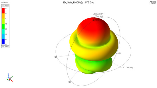 Three-dimensional radiation pattern, RHCP @ 1.575 GHz.
