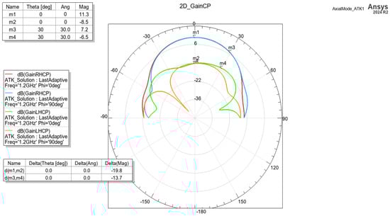 The cross-polarization properties are presented in Figure 7. It is evident that within the main beam, the XPD varies between −20 dB for the boresight to −15 dB in a cone of ±30 deg. Although cross-polarization discrimination is not critical for GNSS applications, for the purpose of the study and methodology purity, such a high value is desirable.