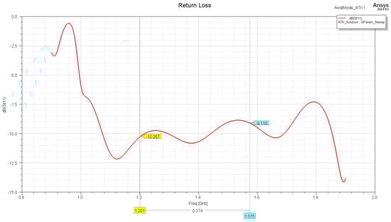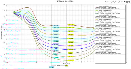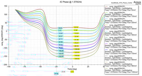 The matching of the helix antenna is performed by bending the conductor that is closest to the connector toward the ground plane. This changes the characteristic impedance of the wire and creates a quarter-wave transformer, which matches the helix impedance (120–140 Ohm) to one of the connectors (75 Ohm). The simulated results of the return loss are presented in Figure 8 and show acceptable performance for a receive-only antenna. The phase center position estimation for both frequency bands is presented on Figure 9 and Figure 10, showing stable performance at approx. 20 mm from the ground plane.