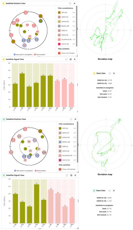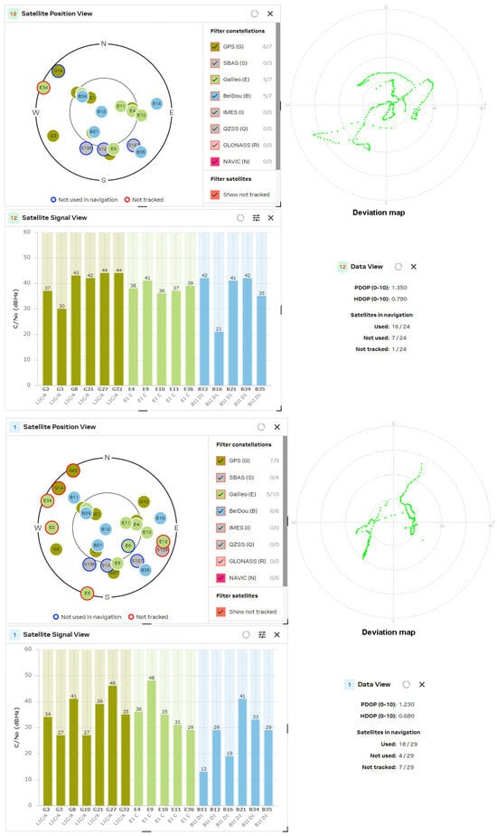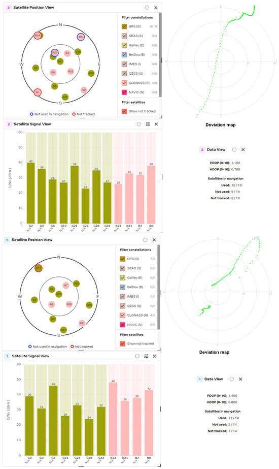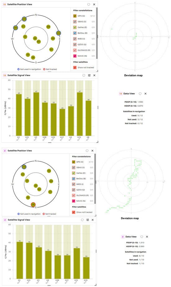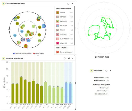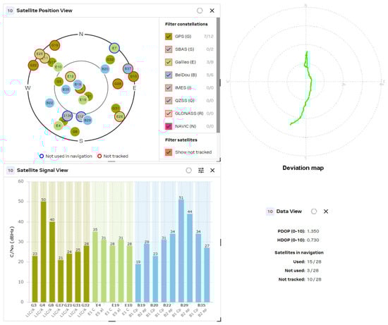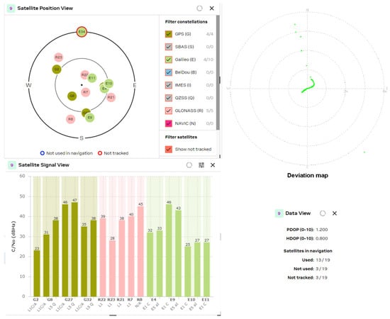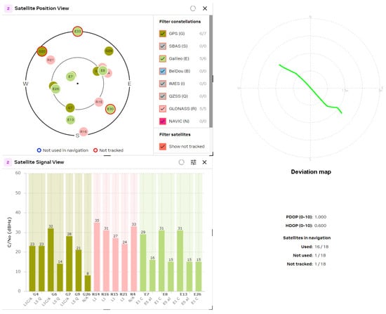 Similar results were obtained for the latest generation GNSS receiver, U-blox NEO F10T (Figure 17). The number of tracked satellites increased to 24 ÷ 28, but the PDOP and HDOP parameters were not improved compared to the ME32GR01 (MinewSemi, Shenzhen, China) receiver, because L5 satellites are not an appropriate choice for the constellation (the only visible L5 satellite, E25, is not tracked). The reception of L5 signals enhanced the GPS system’s penetration due to its higher power and unique wavelength properties, which offer slightly better penetration capabilities through obstacles like foliage and building materials.
