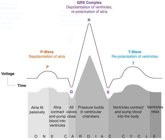 Vagal tone determines how stressed the nervous system is and can be measured with HRV using an electrocardiogram (ECG) [14]. ECG records sinus rhythm or the rhythm of the heart. The sinus node determines the rhythm by generating electrical signals that make the heartbeat. One cardiac cycle is called the PQRST complex. It is a process that repeats in healthy humans to make a heartbeat. Figure 1 itemises each stage of a PQRST complex.