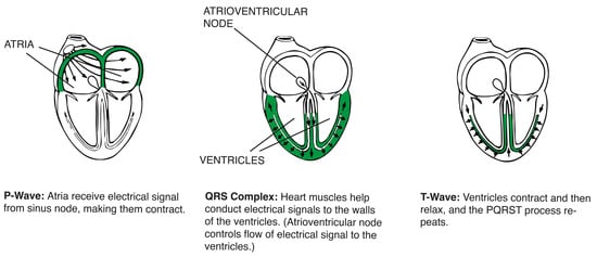 Movement of electrical signals sent by the sinus node during a PQRST complex (one cardiac cycle) [17].