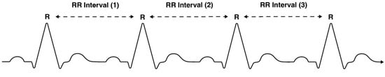 Electrical activity of the sinus node is defined by a balance of sympathetic nervous system activity (which accelerates it) and parasympathetic nervous system activity (which slows it). Fluctuations in blood pressure, heart rate, and vascular tone are all determined by the sympathetic and parasympathetic nervous systems. This is an autonomic nervous system (ANS) state termed sympathovagal balance, which is dictated by sympathetic and parasympathetic influences. HRV is a measure of sympathovagal balance—it is a metric of the differences between successive RR intervals (the time gap between R’s) in a PQRST complex. An RR interval is the difference between successive R waves in a PQRST complex (see Figure 3). Parasympathetic activity is indicated by a high HRV reading, while low HRV indicates sympathetic activity [18].
