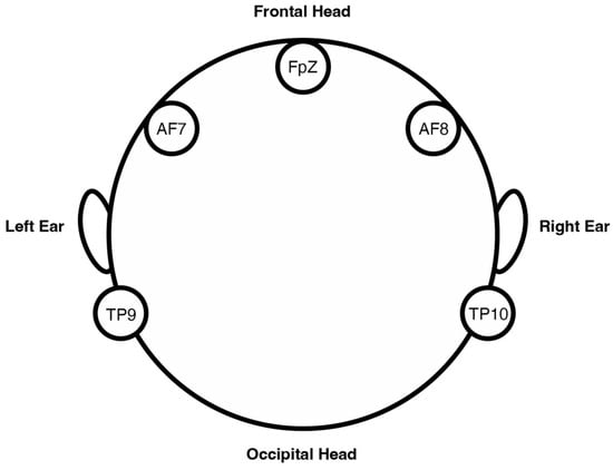A Muse S (Gen 2) EEG device was used to measure the electrical activity of the delta (δ), theta (θ), alpha (α), beta (β), and gamma (γ) frequency bands. It has one reference electrode and six channels, as well as four working nodes and two auxiliary channels. Four nodes measure electrical current with respect to a zero-voltage reference node. Two auxiliary channels are used for calibration, which can record additional peripheral signals (the latter was unnecessary for the purpose of the present study). The four working electrodes are located at AF7, AF8, TP9, and TP10, with a single reference electrode at FpZ. AF7 and AF8 measure activity in the frontal lobe, while TP9 and TP10, located above the ears, record information from the temporal lobes (see Figure 4 and Figure 5). AF stands for “anterior frontal” and TP for “temporal parietal”, i.e., two brain areas associated with the prefrontal cortex and the temporoparietal junction, respectively. These areas of the brain are responsible for decision-making, attention, and sensory integration, i.e., aspects of cognitive processing that, amongst other things, relate to the emotional processing and evaluation of stimuli; see, for example, [61].