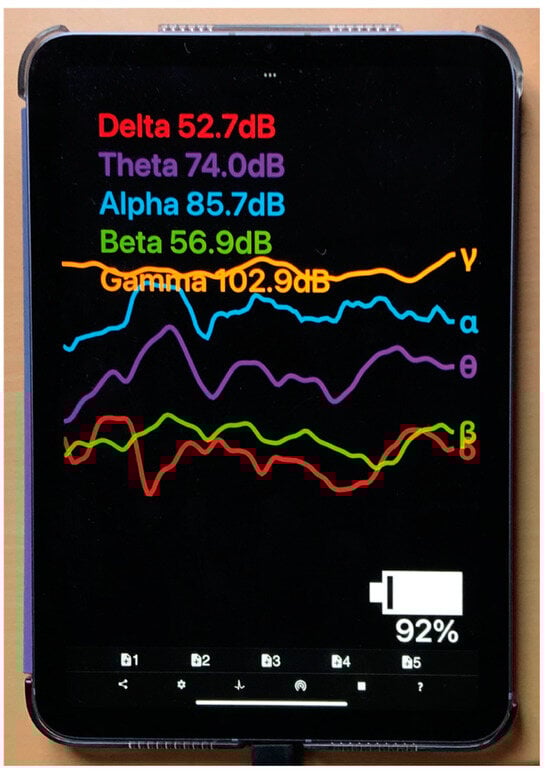 To avoid measurement errors and ensure sustained electrode contact, the participants remained still throughout the duration of VSM exposure. This EEG device recorded raw data from the 4 electrodes at a sampling rate of 256 Hz. It was connected via Bluetooth to the iPad application Mind Monitor [62], which records signals from the headband in real time. Mind Monitor processed the raw EEG data from each of the four electrodes and performed an FFT spectral analysis. That is, like light, the EEG signal consists of a multitude of wavelengths or frequencies. The spectral analysis broke the overall signal down into these frequency components and divided them into the following five frequency bands: delta (<4 Hz), theta (4–7 Hz), alpha (8–15 Hz), beta (16–31 Hz), and gamma (>31 Hz) [63]. These were visualised in the app. See Figure 6 as well as Section 2.2.3 and Section 2.2.4 for further details.