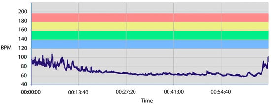 A Polar H10 chest strap was used to measure ECG as it offers optimal accuracy and smartphone connectivity [49]. The Polar H10 chest strap uses a sampling rate of 1000 Hz, and it is the gold standard for RR interval assessments [50] used by professional athletes and in research to calculate HR and HRV values automatically. This device was favoured because of its reliability and validity with respect to recording HRV parameters accurately [51]. The apparatus was specifically chosen for these reasons, with the electrode dampened prior to application to mitigate potential measurement errors through loss of sensor contact. The device was connected via Bluetooth to the smartphone recording app Heart Rate Monitor [67]. Figure 7 is an ECG recording of a participant during this study.