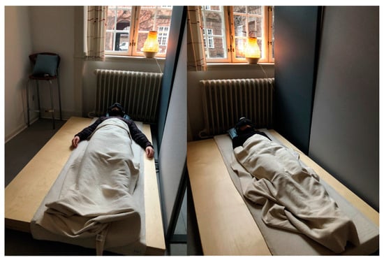 This study tests the efficacy of a VibroAcoustics Bass Module [43] on which participants lay in the supine position. The wooden device is the size of a single mattress and houses three transducer speakers with a frequency range between 20 and 80 Hz. A mobile phone was connected via aux to the module, which played sound designed for this study. The participants listened to this through Bose QuietComfort 35 II noise-cancelling headphones (see Figure 8).