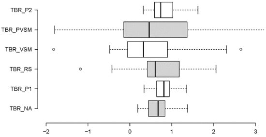 Because of heterogeneous variances, the Friedman test was applied to the TBR data. The overall effect size of this test was estimated in terms of Kendall’s W. The Friedman test revealed a significant main effect of stage on the average TBR levels across all participants (c2[5] = 14.714, p = 0.012, W = 0.1); see Figure 9.