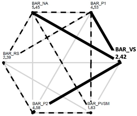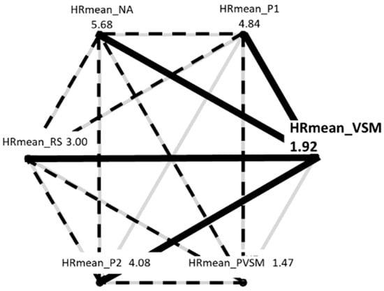 In the following, the results of each measure (dependent variable) are addressed individually. Each results summary is accompanied by two figures, i.e., a box plot and a hexagon plot. The box plot is based on the established quartile structure. Outliers are separately marked as unfilled circles and defined as values that are outside the 3rd quartile (75% of the distribution of the data) and additionally exceed the interquartile range by a factor of 1.5. The hexagon plot gives a quick overview of the number and nature of the significant differences in the post hoc multiple paired comparisons tests. Each of the six conditions of stage is shown with its mean, and thick black lines indicate the significant findings—in the form of solid lines when they are related to the VSM condition.