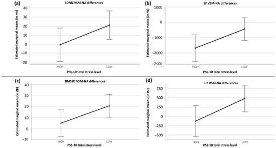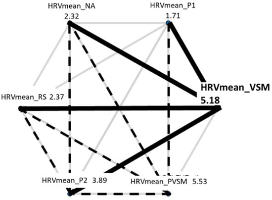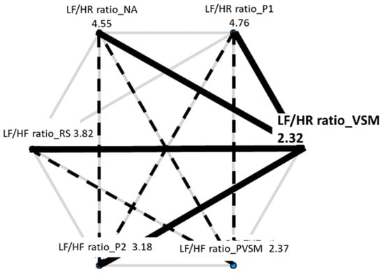 VSM increases HRV, causing more parasympathetic activity (increased RMSSD and HF) and less sympathetic activity (reduced SDNN and LF). VSM will reduce HR BPM [37].