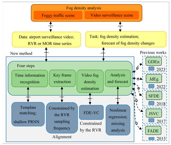 The airport’s video surveillance and visibility measurement data can be used to monitor, analyze, and predict changes in fog density. To achieve this task, we propose a video Fog Density Estimation algorithm based on Visibility Calibration, named FDE-VC, and use it as a basis for fog density analysis and prediction, providing decision-making reference for airport management. The proposed method consists of four steps: image-based time information recognition, time-constrained key frame extraction, FDE-VC algorithm, and forecast of fog density changes.