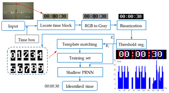 Figure 2 shows that the temporal information is displayed in the top-left corner of each frame. By specifying a fixed box, the position of time information can be located and partitioned. We use threshold segmentation to get figure blocks. Then, the figure template matching algorithm is employed to recognize time digits from the 500 randomly sampled frames. After manual checking, we use these identified figures to form a training set. Finally, we use a shallow neural network for pattern recognition (Shallow PRNN) [