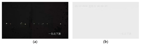 Black screen frame (a) and white screen frame (b). The black screen occurs in the 18th frame of the video; the white screen frame occurs in the 49th second of the video. Note: The information in the upper left corner of image (b) is the date (13 March 2020), Friday, and time (00:00:49); the information in the bottom right corner of each frame image is the orientation, i.e., Northeast Decline.