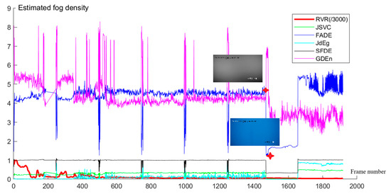 RVR and the fog density values of key frames of the video are estimated using the FADE, JSVC, SFDE, JdEg, and GDEn methods. The time of two key frame images labeled with red stars are 6:07:00 and 6:08:00.