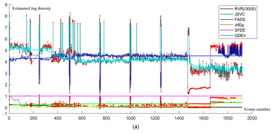 Figure 9a. In this figure, the RVR values are obtained from measurements before 8 a.m. and the visibility values are calculated using Equation (4) based on fog density values estimated by the JSVC, FADE, JdEg, SFDE, and GDEn methods.