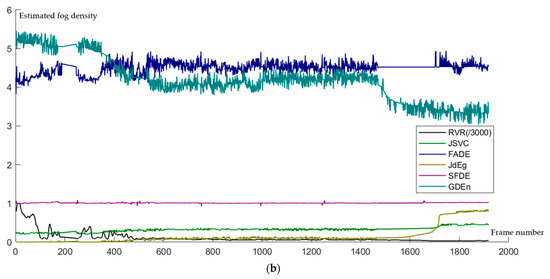 Figure 3, we can find that after 8 o’clock, there has been a significant improvement in visibility. However, there is still moderate fog affecting the visible distance. Therefore, the visibility values estimated by FADE and SFDE are overestimated; the visibility values estimated byGDEn, JSVC, and JdEg are slightly underestimated.