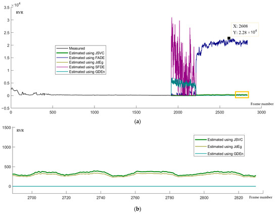 Estimated RVR from 8 a.m. to 12 a.m. (a) The RVR value obtained from measurements before 8 a.m. and the visibility value calculated using the Equation (4) based on fog density values estimated by five methods. (b) An enlarged view of a time slice labeled with a golden color rectangle in (a).