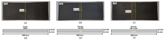 Three CFRP plates, denoted as T1, T2, and T3, each with dimensions 500 × 200 × 0.56 mm3, were considered for the study. Delaminations were introduced in the specimens by inserting Teflon films between the fiber layers. The plates were fabricated using pre-impregnated composite fibers. Each CFRP plate consisted of four fiber layers oriented in the sequence of [0/90/90/0]. Figure 1 provides the schematic profile of the plates and photographs of the CFRP plates. The delaminations covered the entire width of the plates and extended 5 mm, 20 mm, and 50 mm in the length direction, as shown in Figure 1a–c, respectively. A schematic of the profile view of the CFRP plates is presented in Figure 1d–f, showing extensions of 5 mm, 20 mm, and 50 mm in the length direction, respectively.