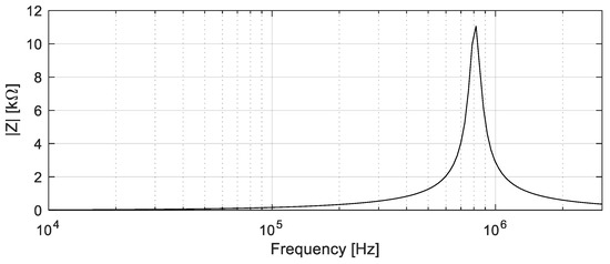 The measurement system used to evaluate the condition of the CFRP plates is presented in Figure 3. The ECT probe was attached to a two-axis positioning system to perform a C-scan around the location of each delamination. The probe was fixed to the scanning system with a lift-off of 0.5 mm between the surface of the CFRP specimen and the bottom of the probe. Given that that CFRP structures have low electrical conductivity, it requires ECT probes to operate at high testing frequencies to inspect these materials. The testing frequency was chosen to operate at a frequency within the near electrical resonance band to enhance the sensitivity and signal-to-noise ratio of the ECT probe [22]. The impedance characteristic curve of the sensing element, which is shown in Figure 4, was measured using an LCR meter (3532-50 from Hioki, Nagano, Japan), considering the capacitance of the coaxial cable and the capacitance of the oscilloscope channel. Accordingly, a sinusoidal signal of 0.81 MHz of testing frequency with a peak-to-peak amplitude of 20 V was applied to the excitation coils using a function generator (AFG3102 from Tektronix, Beaverton, OR, USA). The use of an inductive coil as a sensing element at higher testing frequencies provides improved sensitivity and resolution for detecting small variations in the material properties, enhancing the accuracy of the defect characterization. However, at this frequency, the background noise, due to the surface conditions and the lift-off variations, can be also detected. Therefore, for each position of the probe, a signal averaging of 30 measurements was performed to increase the signal-to-noise ratio. The scans were performed with the three coils aligned with the y-axis of the positioning system. The positioning system moved the probe in steps of 1 mm over a region of 130 × 10 mm2 around the position of each delamination. The measurement system was maintained with stable connections to minimize the risk of parasitic capacitances that can appear in the excitation and sensing circuits. An oscilloscope (TDS5032B from Tektronix, Beaverton, OR, USA) was used to acquire the voltage across the excitation coils and sensing element. A personal computer was used to collect these data through a GPIB interface and control the positioning system through the RS232 interface. The results obtained for each scan are presented in Section 4.
