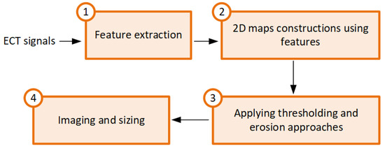 In the context of ECT, the extraction of appropriate features and parameters that can analyze and determine the defects presence, location, and characteristics is essential. Perturbations in the amplitude and phase in the detected signals indicate the presence of damage in the structure [15,16]. Variations in the impedance of the ECT coils can also indicate the presence of defects [17,18]. The analysis of the response of the ECT probes at different frequencies can also assist in the evaluation of the depth, location, and type of defects [19,20]. Parameters such as the signal-to-noise ratio of the resulting ECT images can be also analyzed for damage assessment [21]. Nevertheless, efficient damage characterization requires appropriate signal processing techniques to interpret ECT data.