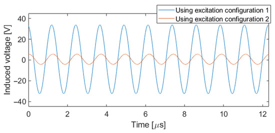 Signals of the sensing element of the ECT probe applying the two different excitation configurations.
