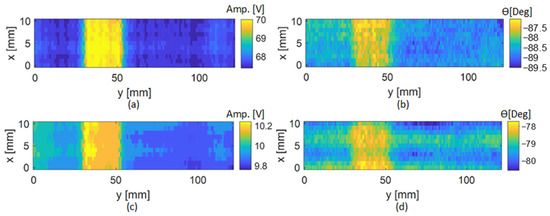 In this experimental study, particular attention was paid to compare the results obtained with the two excitation configurations by analyzing the perturbed amplitude of the induced voltage in the sensing element and the phase shift between the excitation and reception signals. The original scan data, which are directly acquired using the oscilloscope, include the peak-to-peak amplitude and phase shift between the excitation and receiver signals. The C-scans were performed with the delaminations located at 0.42 mm below the surface of the CFRP plates, i.e., between layers 3 and 4. The resulting C-scan maps of the amplitude and phase shift will be referred to as Amp and ϴ, respectively. Figure 7 shows an example of the amplitude and phase shift maps obtained using the two different excitation configurations for the test sample T2, where the amplitude maps are represented in volts and the phase shift maps are represented in degrees. Figure 7a,b show the results obtained using configuration 1, and Figure 7c,d show the results obtained using configuration 2.