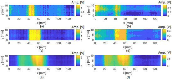 C-scan representations showing the maximum amplitude variation for different delaminations and excitation configurations: (a) 5 mm delamination using excitation configuration 1; (b) 5 mm delamination using excitation configuration 2; (c) 20 mm delamination using excitation configuration 1; (d) 20 mm delamination using excitation configuration 2; (e) 50 mm delamination using excitation configuration 1; (f) 50 mm delamination using excitation configuration 2.