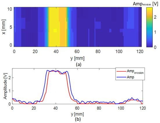In this paper, the resulting image of the amplitude map after employing the erosion method will be referred to as Amperosion. For example, Figure 9a depicts the results of the Amperosion map for the case of Figure 8c. Figure 9b depicts an average of the y-line plots before and after applying the erosion procedure.