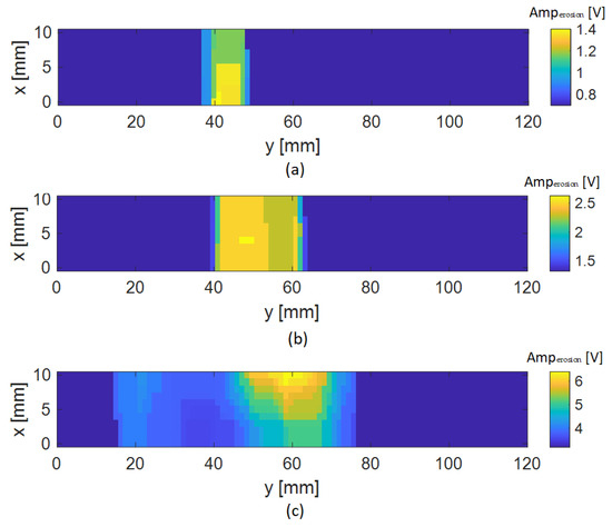 From Figure 9, it is possible to notice that a reduction of the region of the perturbation along the y-axis is visible in the results. This image processing procedure was repeated for the amplitude maps shown in Figure 8a,c,e. In Section 7, a comparison of the accuracy of the delamination length estimation before and after applying the erosion method is presented for all cases.