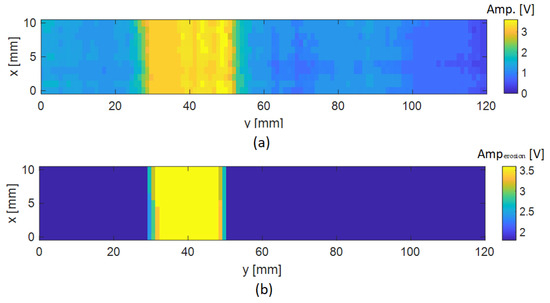 Results of applying the erosion method on an amplitude map: (a) C-scan image after applying the erosion method; (b) Y-axis view of the results before and after applying the erosion method.