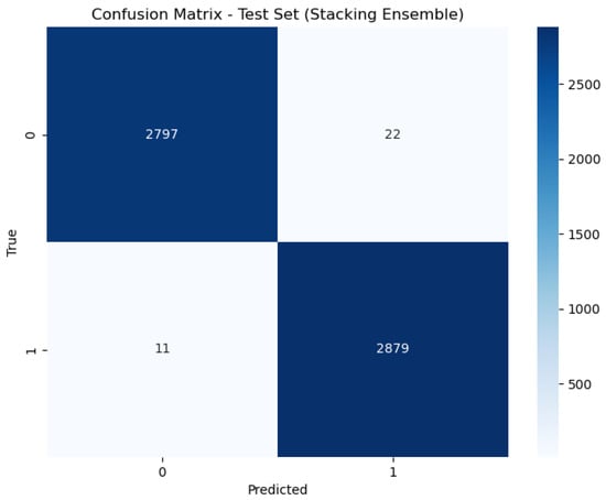 For the Stacking model, the AUC is reported as 1.00, which signifies a perfect classification performance. This means that the Stacking model achieves flawless separation between positive and negative classes across all threshold levels, classifying all positive cases correctly and all negative cases correctly. This exceptional performance is reflected in its accuracy rate of 98.88%, demonstrating its effectiveness in correctly identifying the class of each sample.