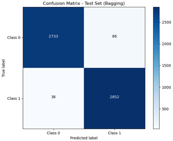 The Bagging model, with an AUC of 0.99, also performs extremely well, showing a slight decrease in performance compared to Stacking. An AUC of 0.99 indicates that the Bagging model nearly achieves perfect separation between classes. This high AUC corresponds with its accuracy rate of 97.83%, which confirms its high level of classification accuracy and reliability.