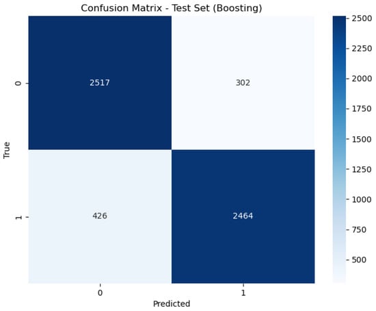 In contrast, the Boosting model exhibits an AUC of 0.89, indicating good but less optimal performance compared to the other models. While still demonstrating strong classification ability, the lower AUC reflects a slight reduction in its ability to distinguish between classes. This performance is consistent with its accuracy rate of 88.68%, which, while still high, is lower than that of the Stacking and Bagging models.