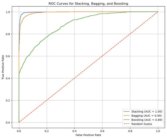 Figure 9 represents the Performance Visualization of ROC curves for the Stacking, Bagging, and Boosting models. The ROC curve (Receiver Operating Characteristic curve) is a graphical representation of a classification model’s performance across various threshold settings. It illustrates the trade-off between sensitivity (true positive rate) and 1-specificity (false positive rate). The Area Under the Curve (AUC) quantifies the model’s overall ability to distinguish between positive and negative classes; a higher AUC indicates superior performance.