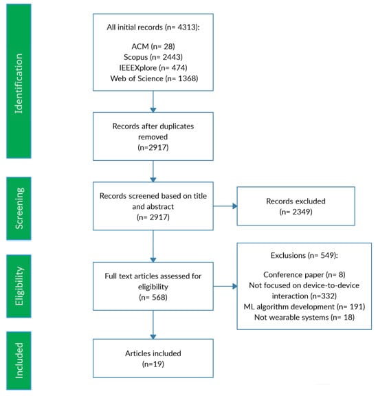 From the initial pool of 4313 articles, 28 were from ACM, 474 from IEEE Xplore, 1368 from Web of Science, and 2443 from Scopus. A flowchart of the study selection process is depicted in Figure 1. After removing duplicates, 2917 studies remained for screening based on their titles and abstracts. This initial screening excluded 2349 papers that did not meet the inclusion criteria, leaving 568 articles for full-text analysis. Ultimately, 19 articles focusing on IoT, M2M, and user tracking through wearables were included. The publication year analysis shows a peak in 2020 with 10 articles, followed by 2022 with 6 and 2019 with 5. The years 2021 and 2023 each contributed two articles. This distribution indicates a peak in research output in 2020, with decreased activity in 2021 and a resurgence in 2022, reflecting dynamic research trends in the field.