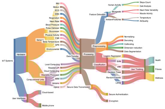 Novel IoT systems facilitate multimodal interactions through advanced frameworks such as machine-to-machine (M2M) communications. Their primary goal is to enable an efficient data exchange between devices without human intervention [25,26]. These frameworks utilize protocols such as message queuing telemetry transport (MQTT) and constrained application protocol (CoAP) for lightweight and efficient communication [27]. Cloud processing capabilities enhance this integration by allowing vast amounts of data to be processed and analyzed quickly [28]. Concurrently, edge computing is gaining prominence in IoT healthcare applications, reducing latency and improving real-time data processing. This approach allows for immediate analysis and decision-making at the device level, which is crucial for time-sensitive health monitoring scenarios [29]. On-device processing ensures that critical data can be handled locally for immediate feedback and action [30]. This is particularly important for energy efficiency, as it reduces the need for constant data transmission, thereby extending battery life in wearable IoT devices. Human–computer interaction (HCI) plays a vital role in this ecosystem. Intuitive mobile and desktop applications provide users with accessible interfaces to manage and interpret their health data effectively [31]. These applications not only display real-time data but also offer personalized recommendations and alerts, which empower individuals to make informed decisions about their health and wellness [32].