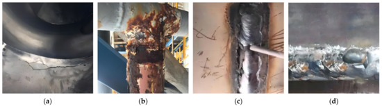 Several common types of surface defects: (a) surface cracks; (b) corrosion; (c) biting edges; (d) weld lumps.