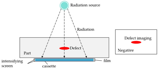 RT is a technique that utilizes X-rays or gamma rays to penetrate materials and measure radiation absorption for detecting internal defects [86,87,88]. Depending on the density and thickness of the tested component, incident X-ray photons undergo varying degrees of attenuation during transmission and also scatter due to interactions with atoms. If a component has a defect or variation in material properties or thickness, incoming X-ray photons will be attenuated differently as they pass through. Subsequently, the transmitted X-ray photons create a latent image, which is captured using X-ray film or digital detectors and then converted into a two-dimensional radiographic image of the component. Therefore, radiographic images in NDT provide crucial information about the internal structure of objects and can reveal internal defects. The schematic diagram of the RT principle is shown in Figure 9.