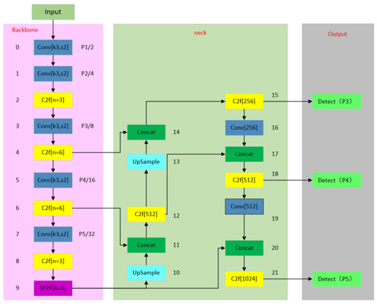 Backbone network: The architecture of YOLOv8 delicately integrates the Conv module, the C2f module, and the SPPF module to form an efficient target detection network: the Conv module is responsible for adjusting the resolution, and the number of channels of the image; the C2f module skillfully integrates the global semantic information and the local target information to enhance the model’s in-depth understanding of the image content; the SPPF module enhances the model’s knowledge of the image content by pooling the features at the same scale by pooling features, enabling the network to perform effective target detection in input images of various sizes.