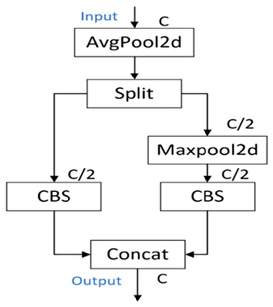 In deep learning models, downsampling is widely used to reduce the spatial dimension of the feature map. Most models use a convolution kernel of 3 × 3 and a step size of 2 to perform downsampling operations. Still, it is very likely that the extraction of important information will be lost by reducing the dimensionality without bias. For this reason, the ADown module in YOLOv9 has redesigned the downsampling module. The specific structure is shown in Figure 2. AvgPool is the average pooling layer, Spilt is mainly used for average distribution, Maxpool is the maximum pooling layer, and the CBS on the left side is a 3 × 3 convolution with step size 2. In contrast, the CBS on the right side adopts a 1 × 1 convolution with step size 1. C denotes the number of input channels, and C/2 denotes that the number of channels becomes half the original.