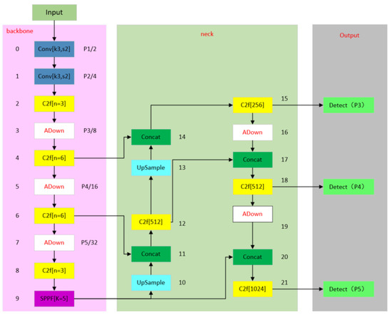 - Since the model’s backbone network uses 3 × 3 convolutional kernels for downsampling and feature extraction, the computational volume is huge and affects the operation speed; this paper replaces the 3 × 3 convolutional kernels used for downsampling the backbone network with the lightweight downsampling convolutional ADown in YOLOv9 [8].