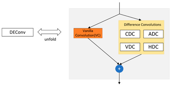 DEConv contains five convolutional layers (four difference convolution kernels and one regular convolution) that are deployed in parallel for feature extraction. Specifically, central difference convolution (CDC), angular difference convolution (ADC), horizontal difference convolution (HDC), and vertical difference convolution (VDC) are used to integrate traditional local descriptors into the convolutional layers, which allows for enhanced representation and generalization capabilities. In difference convolution, pixel differences in an image are first computed and then convolved with a convolution kernel to generate an output feature map, and by designing a difference computation strategy for pixel pairs, a priori information can be displayed and encoded into the CNN. These convolutions are used for feature extraction and learning, enhancing representation and generalization capabilities.