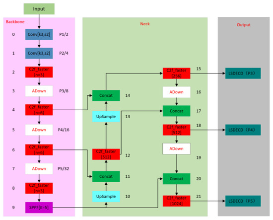 Finally, the main improvement of the network is divided into three parts. The first part is improved by using the red module, replacing the original C2f module with C2f_faster, which has the advantage of a lightweight detection network. The second part is improved by using the white module, replacing the original extraction module with the ADown module. The advantages of this module can not only improve the extraction efficiency but also reduce the number of model parameters and the amount of calculation. In the third part, the dark green module is used to improve the display, and the original detection head is changed to the self-developed LSDECD detection head. The advantages of this module are that it not only improves detection efficiency but also helps the lightweight model.