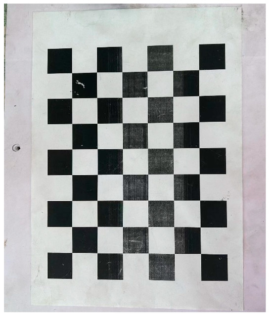 The Zhang Zhengyou [6] camera calibration method was adopted to calibrate the camera’s internal parameters. The international standard chess black-and-white grid calibration board was selected, and it is shown in Figure 11 below. The side length of each square was 25 cm, the length of the corner was set to 7, and the width was set to 6.