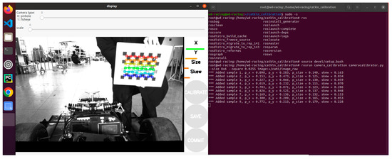 Calibration process: First, open the camera calibration function package, then enter the calibration interface, and slowly move the calibration board in front of the camera from front to back, from left to right, and from top to bottom until the progress bar under X, Y, Size, and Skew on the right side of the program interface turns green, the calibration is completed. Finally, click SAVE to save the calibration result, and put the final parameter matrix into the camera driver’s configuration file to complete the parameter replacement. The camera calibration interface is shown in Figure 12 below.