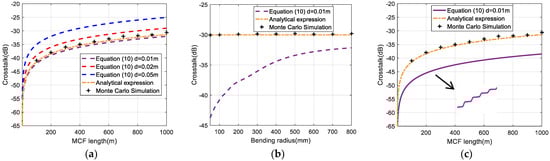 Furthermore, when the effects of bending and twisting perturbations in (12) are taken into account, it shows the IMXT as a function of bending radius for our model compared with former models when FM-MCF length is set to 1000 m, as shown in Figure 4b. The IMXT is significantly suppressed by bending perturbation, especially at a small bending radius. However, the former models cannot work normally with bending perturbation. A similar conclusion can be obtained with twisting and bending perturbations, as shown in Figure 4c, where ,. Moreover, the suppression on IMXT enhances with an FM-MCF length increase. Results in Figure 4b,c illustrate that both the Monte Carlo Model [23] and the analytical expression [24] are not sensitive to bending and twisting perturbations. However, in Figure 4c, we can see that our model reduces the IMXT value by at MCF length, which is because stochastic perturbations increase the effective refractive index difference between cores, which makes the IMXT computed by our theories lower than those of former theories. As the crosstalk increases significantly at the phase-matching point, some fluctuations in the purple curve estimated by our model can be found with changes over the distribution of the phase-matching point [17]. Therefore, our model can well reflect the effects of perturbations on IMXT.