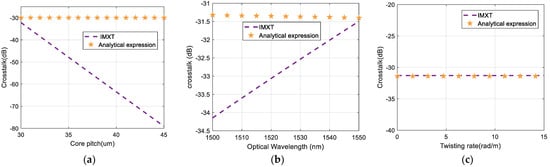 IMXT as a function of (a) core pitch, (b) optical wavelength, and (c) twisting rate for IMXT and analytical expression.